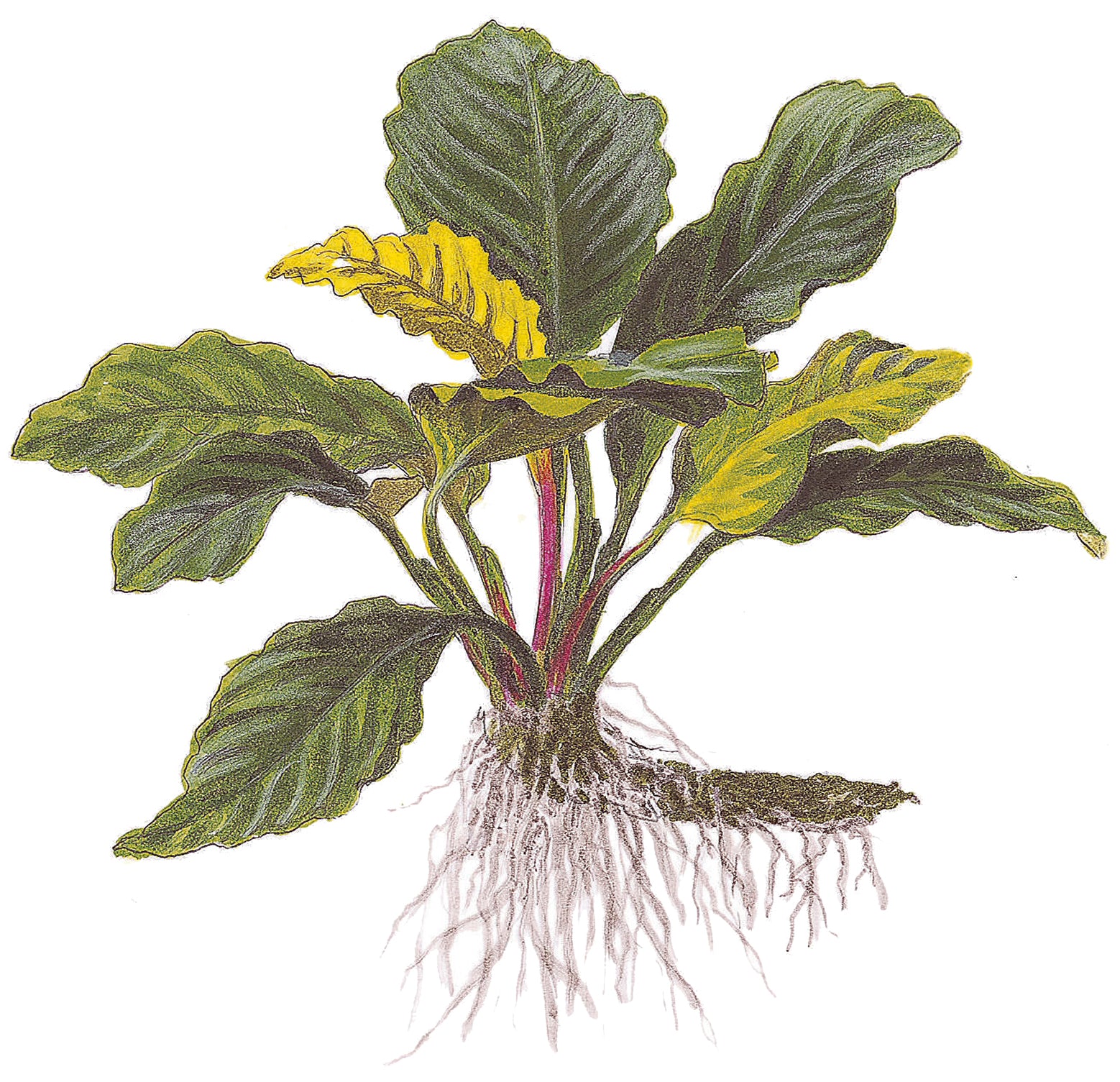 Anubias barteri var. coffeefolia is a very beautiful, low cultivar of Anubias barteri. 15-25 cm tall and a creeping rhizome from 10-15 cm or more. It is characteristic that the leaves arch considerably between the leaf ribs, and the new leaves are red-brown. The colour combination and leaf shape make it an attractive variety in both large and small aquariums. It flowers frequently under water but does not produce seeds there. Anubias species seem to grow so slowly that they do not realise that they have been submerged. It is not eaten by herbivorous fish.
