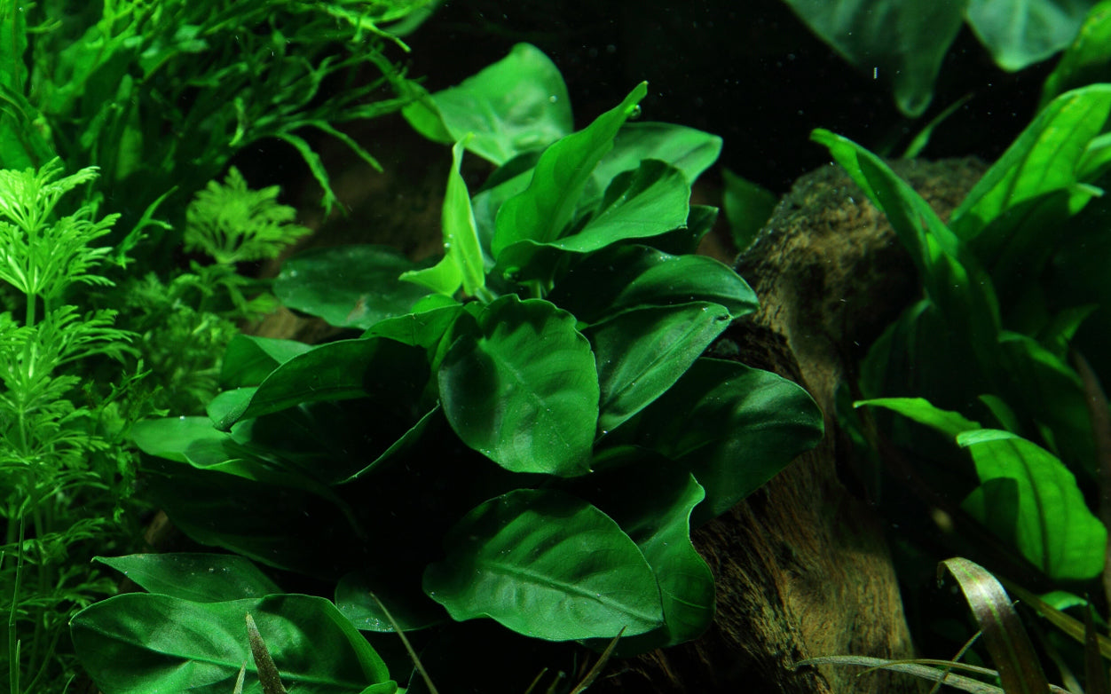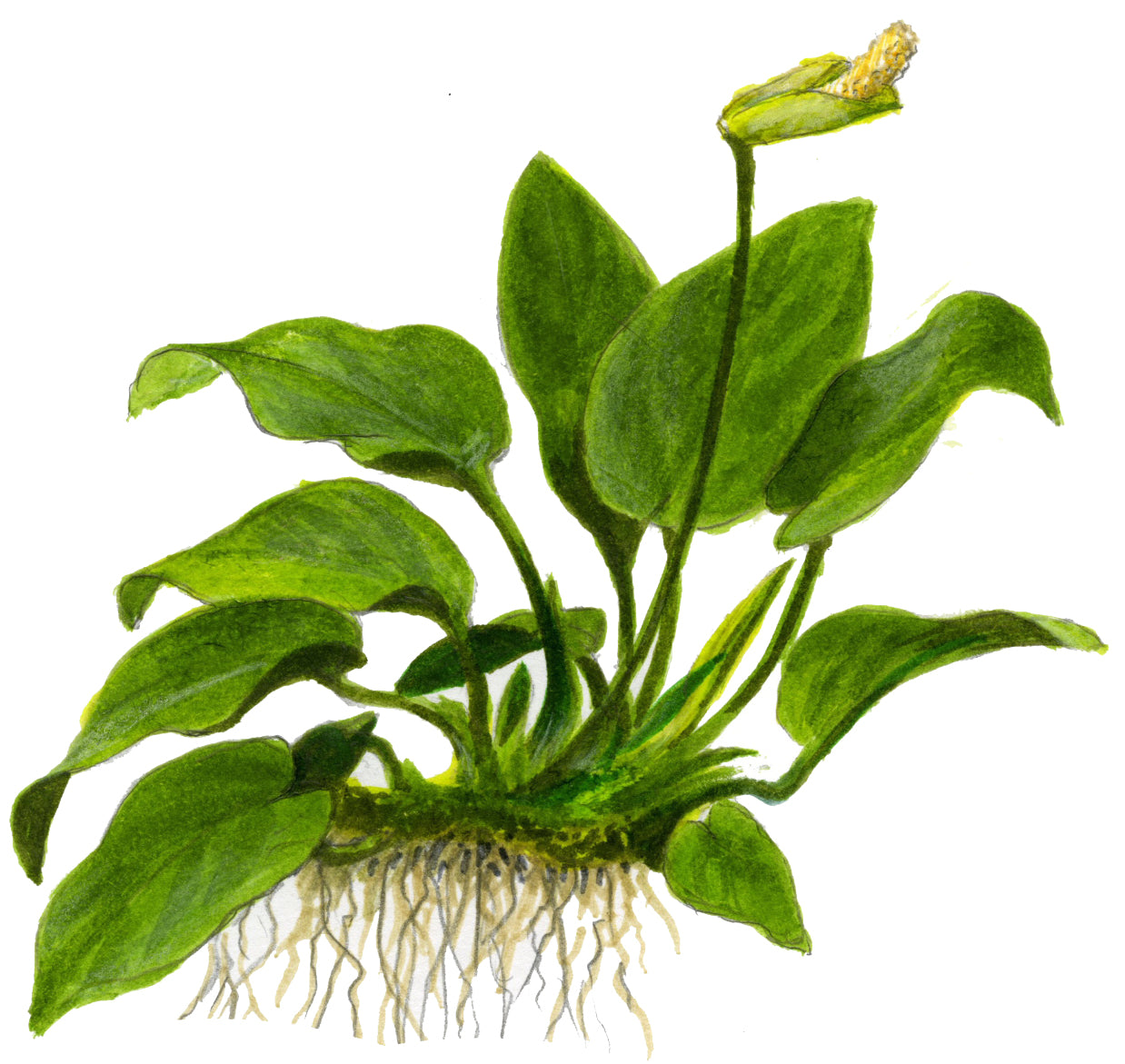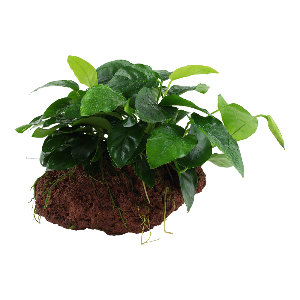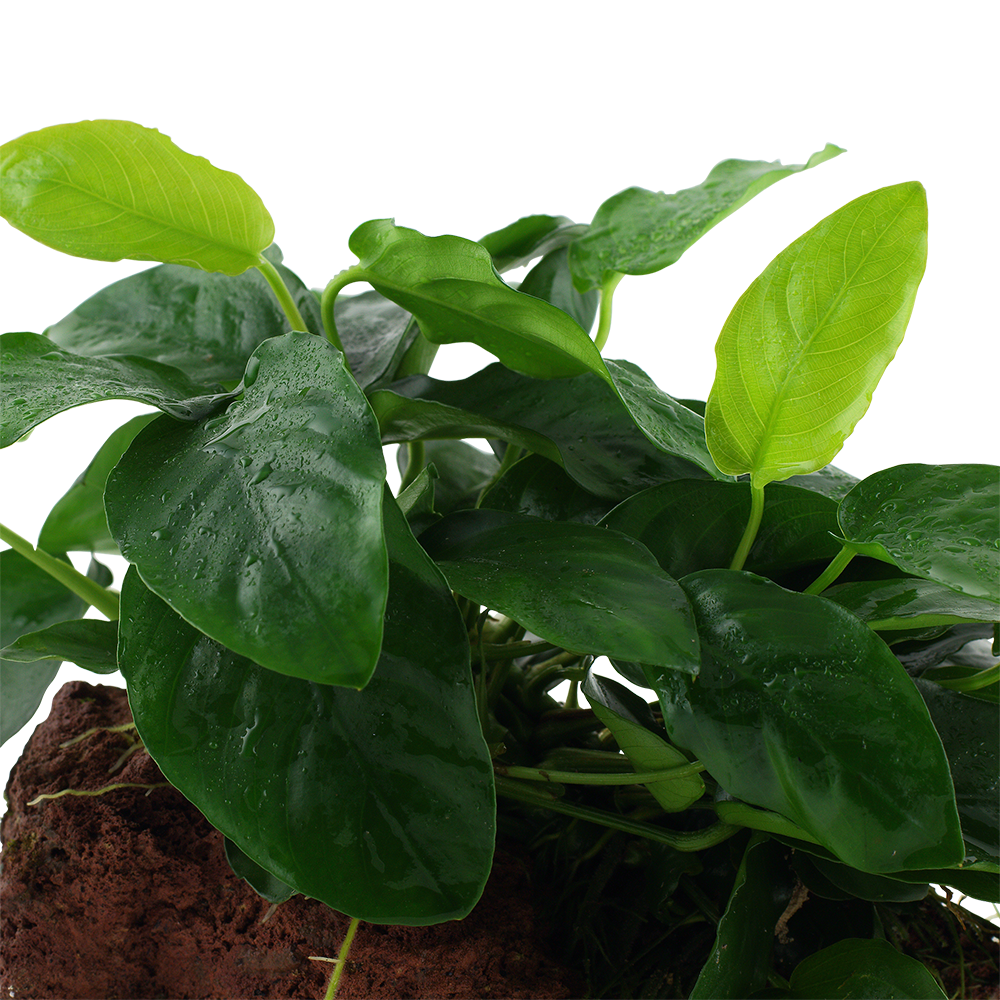 Anubias barteri var. nana is a small, attractive plant which thrives in all conditions. It originates from Cameroon and will reach 5-10 cm height. The rhizome will be 10-15 cm or more. It grows slowly, and the leaves survive for several years, giving slow-growing algae the chance to become established. The best result is achieved by planting on a stone or tree root. If planted on the bottom the rhizome must not be covered because it tends to rot.