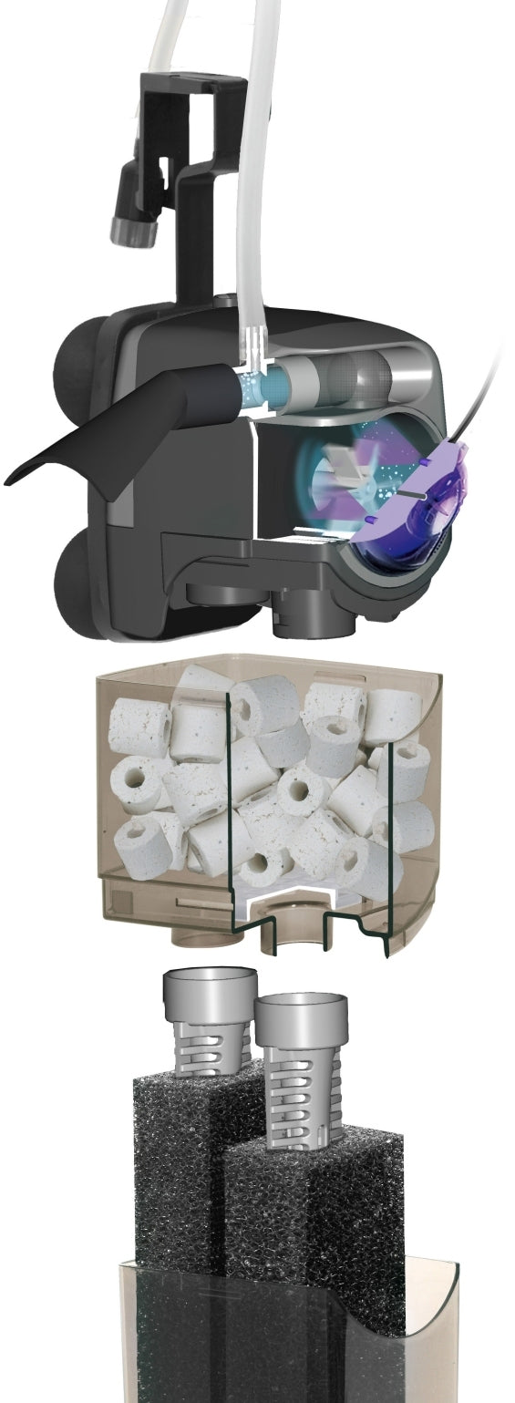 - Dual sponge system — Ensures effective biological and mechanical filtration while protecting beneficial bacteria.