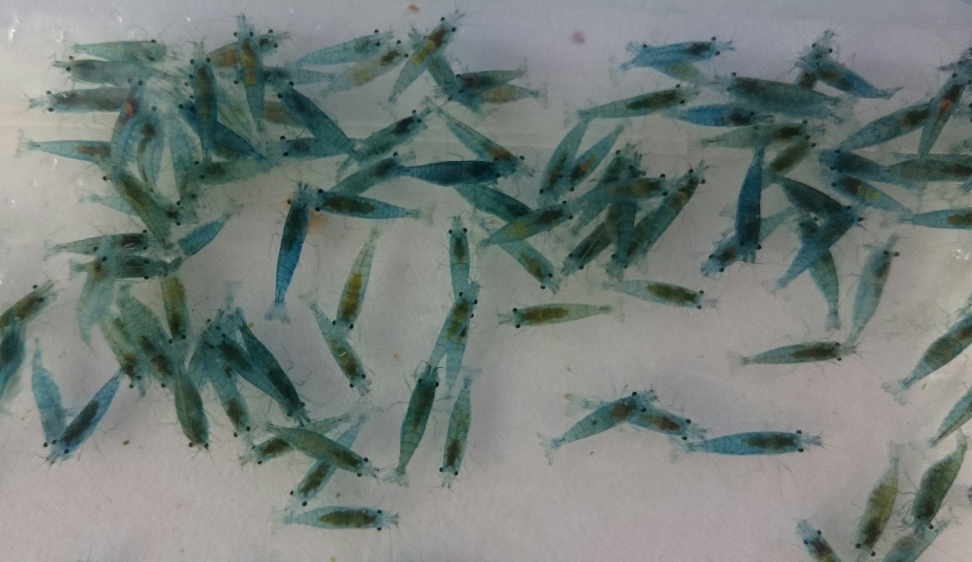 Blue Jelly shrimp vary in intensity from a pale to a mid-blue. Some lines contain red rili leftovers, so tiny red speckles are not uncommon on those.