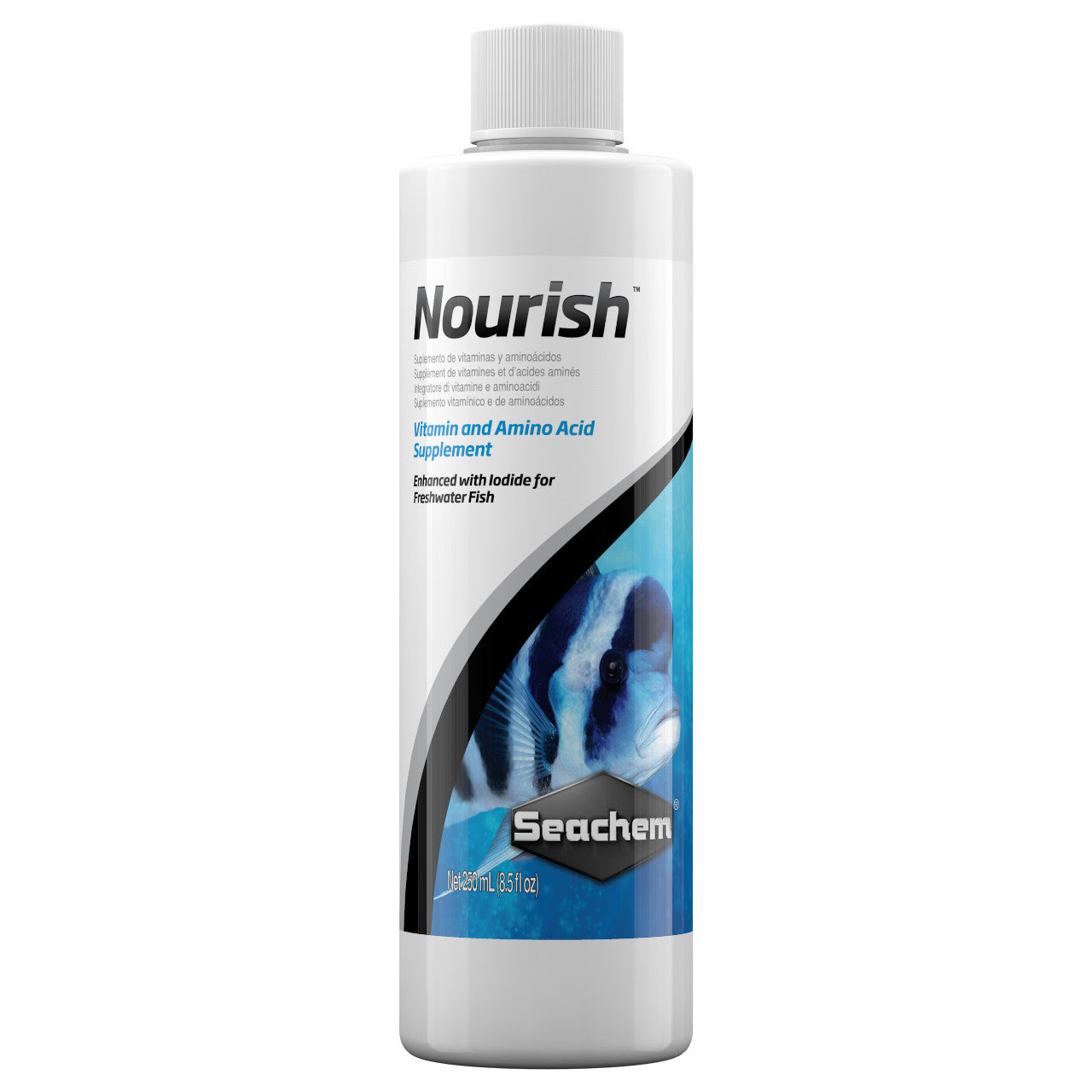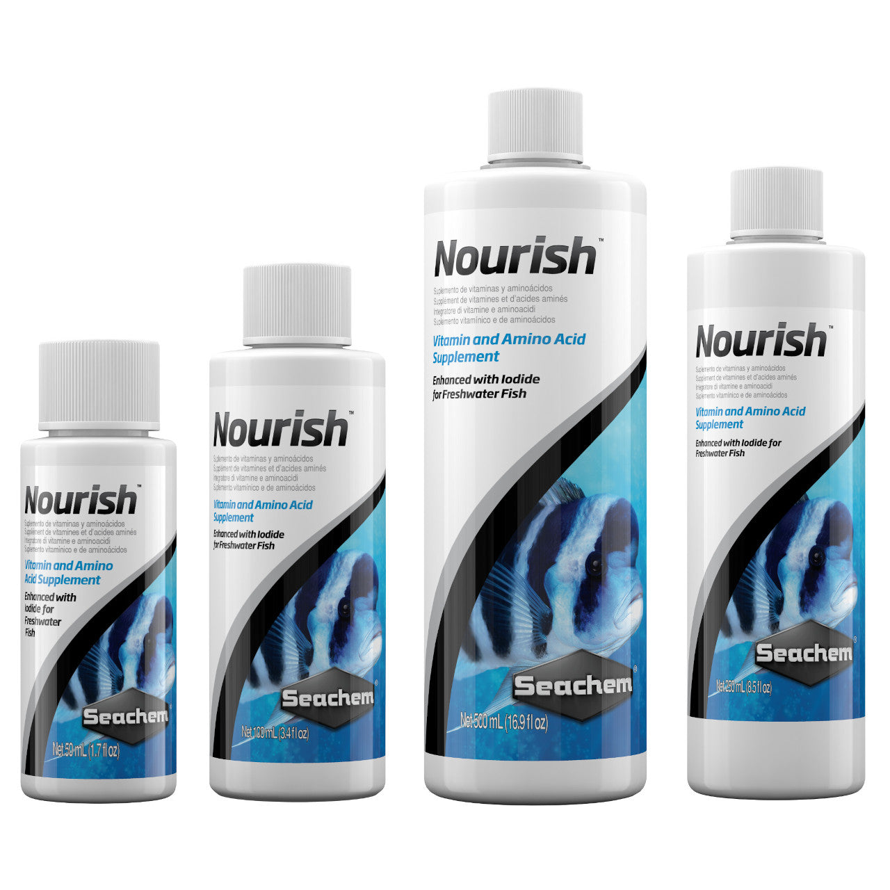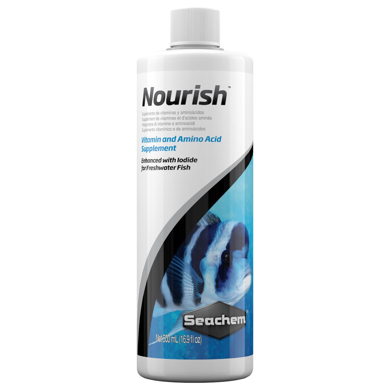 Nourish is a comprehensive vitamin, amino acid, and trace element supplement developed to address nutritional requirements commonly associated with long term closed system housing of freshwater ornamental fish. Nourish contains potassium iodide in a heavy base of spirulina and chlorella. Both spirulina and chlorella contain a rich assortment of amino acids and vitamins. Nourish can be used on marine ornamental fish; however, it is specifically designed for freshwater fish.