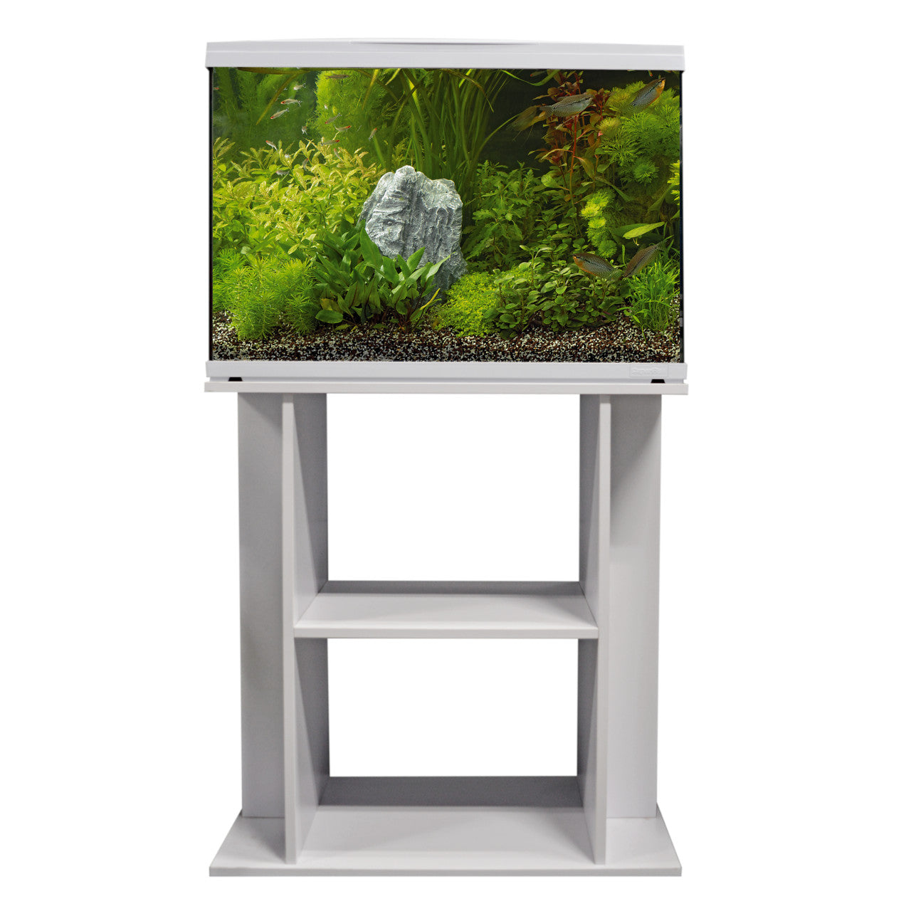 This is a modern 105L complete setup with LED lighting, internal filter, heater and a range of accessories including water conditioner, fish food, fish net and thermometer.